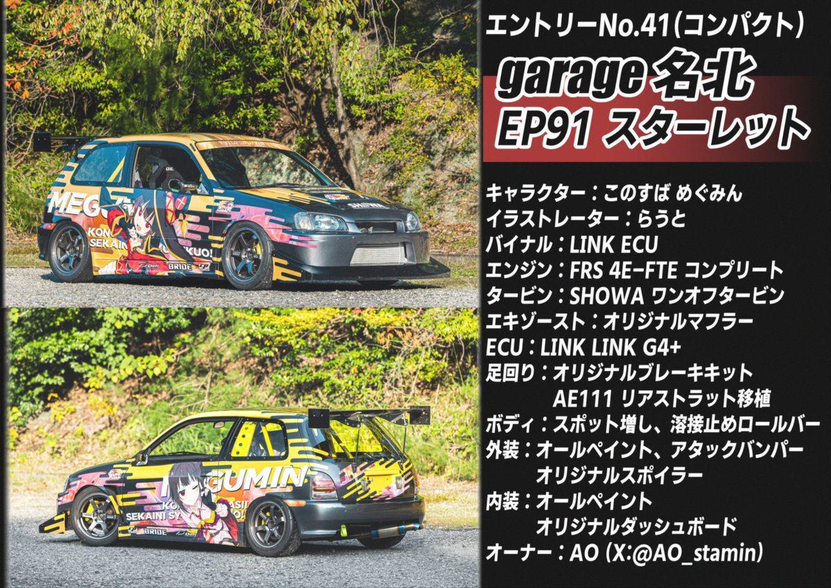 コンセプトは『デモカーの痛車でタイムアタック!』 バイナルは愛用しているLINK ECU スペシはうどちゃんへお願いして、Video Optionの車両紹介風に作ってもらいました!(引用元はJAMのTC2000) サーキットへ来た雰囲気で飾ってるので、会場でぜひ見てください エアーはちゃんと温間で合わせました!w pic.x.com/7MQOWxzbs9 x.com/AO_stamin/stat…